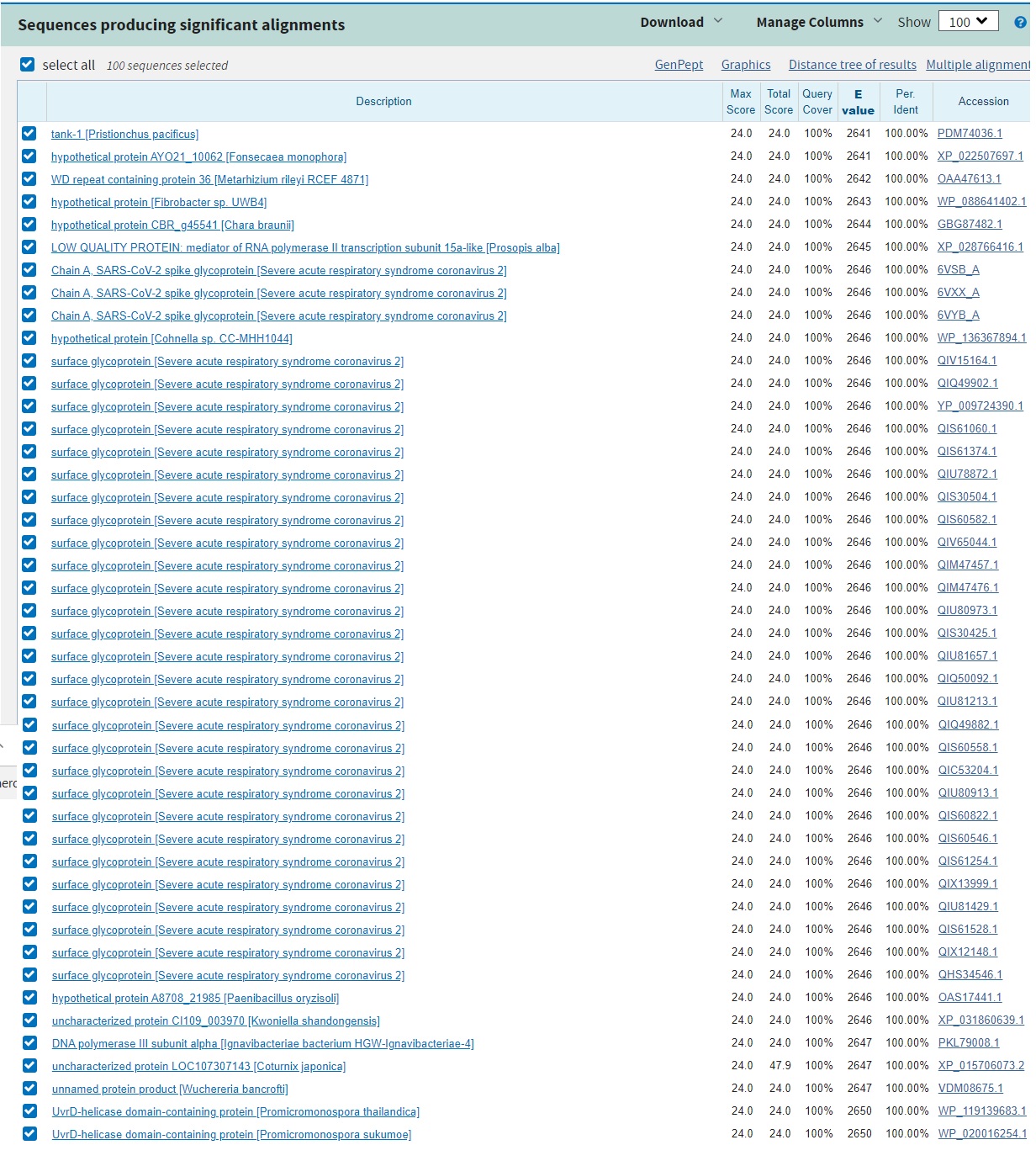 Outre le fait qu’il y a un alignement avec beaucoup de séquences de sars-cov-2, on voit apparaître une grande quantité d’autres homologies chez de nombreux autres virus et bactéries. Le nom est indiqué entre parenthèses.
